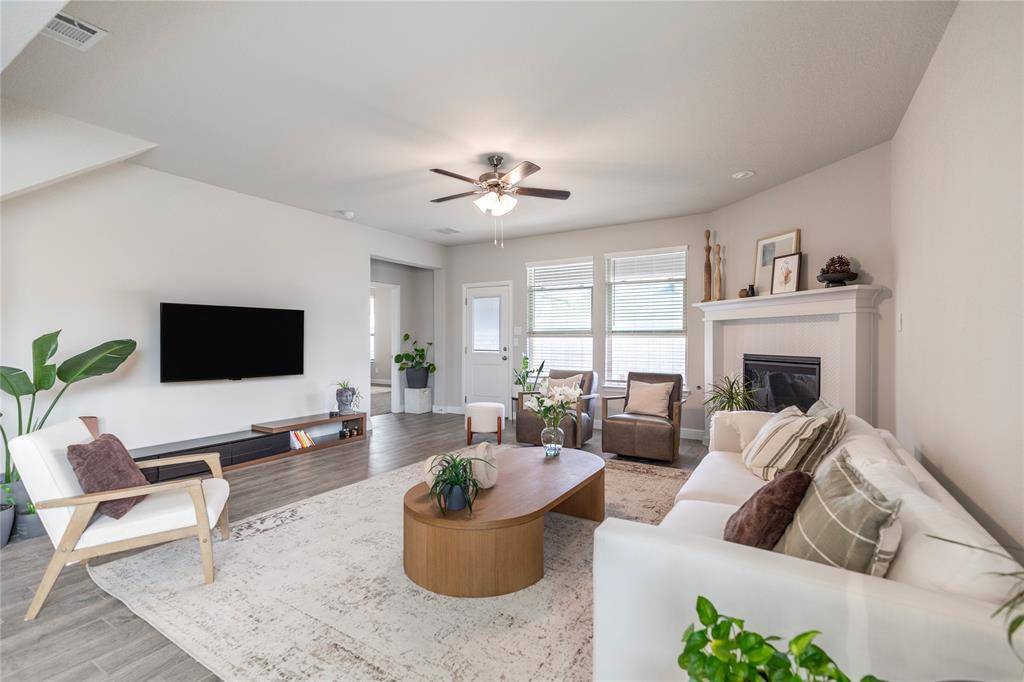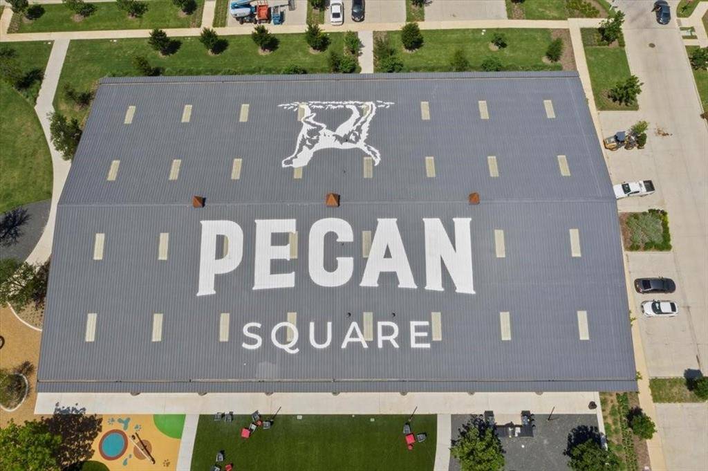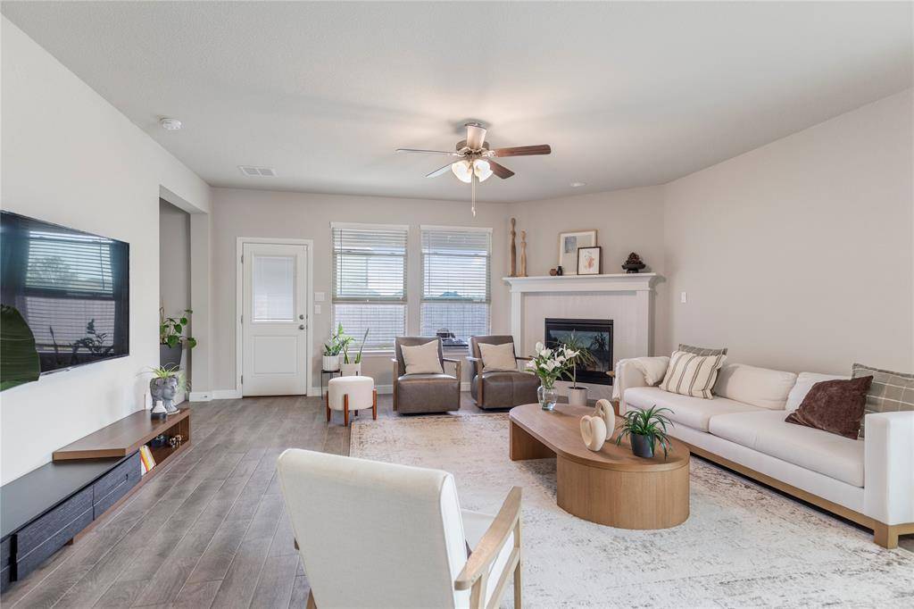 Beautiful 5-bedroom, 3.5-bath, 1.5-story home on a premium corner lot in the master-planned community of Pecan Square. Step inside to soaring ceilings, wood-look tile flooring, recessed lighting, and an open-concept layout perfect for entertaining. A mud room sits at the entry of the home, and the gourmet kitchen features a large island with breakfast bar, Quartz countertops, single basin sink, stainless steel appliances, sleek gray cabinetry, and ample storage, opening to a spacious living room with cozy gas fireplace.