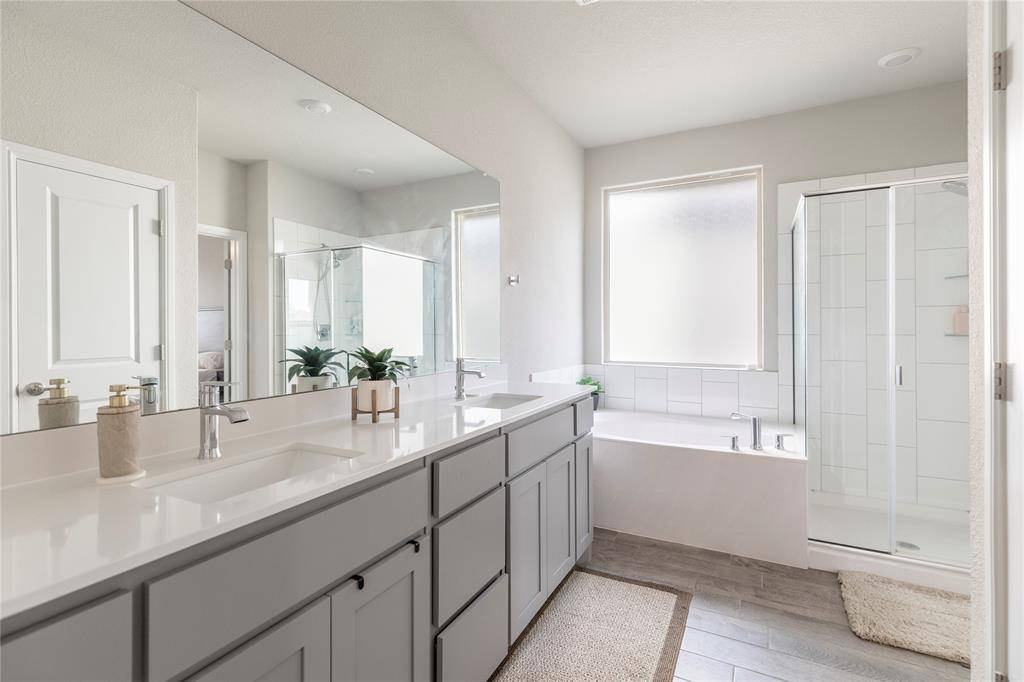 The primary suite offers dual sinks, a large soaking tub, separate shower, and walk-in closet. Three guest bedrooms are downstairs and split from the primary, while upstairs includes a fifth bedroom, full bath, and game room—ideal for guests, teens, or a home office.