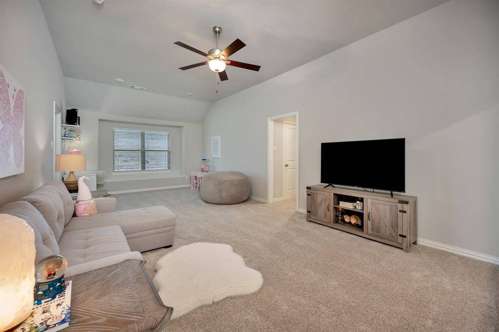 This beautifully appointed home offers 4 spacious bedrooms, 3 full baths, and 2 half baths, all wrapped in stunning curb appeal with a charming brick elevation, lush landscaping, and a rare three-car tandem garage. Inside, the open-concept design strikes the perfect balance of sophistication and inviting warmth. The gourmet kitchen serves as the heart of the home with extensive custom cabinetry, an expansive island built for gathering, premium SS appliances including a gas cooktop, and a stylish butler's pantry with a built-in wine fridge, ideal for both everyday meals and elevated entertaining. The kitchen flows effortlessly into the sunlit living room, anchored by a dramatic floor-to-ceiling stone fireplace that sets the tone for cozy family nights or elegant hosting. The main level is thoughtfully designed for both functionality and luxury. A private study offers the perfect work-from-home environment, while the first-floor media room is tailor-made for movie nights. Guests will appreciate the comfortable downstairs suite, and the primary suite is a true retreat, featuring a spa-inspired bath with a deep garden tub, spacious walk-in shower, dual vanities and an expansive walk-in closet. Upstairs, the home continues to shine with two generous guest bedrooms connected by a Jack-and-Jill bath, plus an oversized game room that's perfect for a kids' hangout, playroom, or hobby space. Step outside to your covered patio overlooking a beautifully sized backyard, complete with a built-in grill + a separate pergola, an ideal setting for weekend barbecues. Perfectly positioned just down the street from the neighborhood park, this home also provides access to Fairway Ranch's resort-style amenities, including sparkling pools, playgrounds, a catch-and-release fishing lake, and scenic jogging and biking trails, creating a true sense of community and connection. Located in the acclaimed Northwest ISD with Cox Elementary nearby, and close to premier dining, this one has it all!