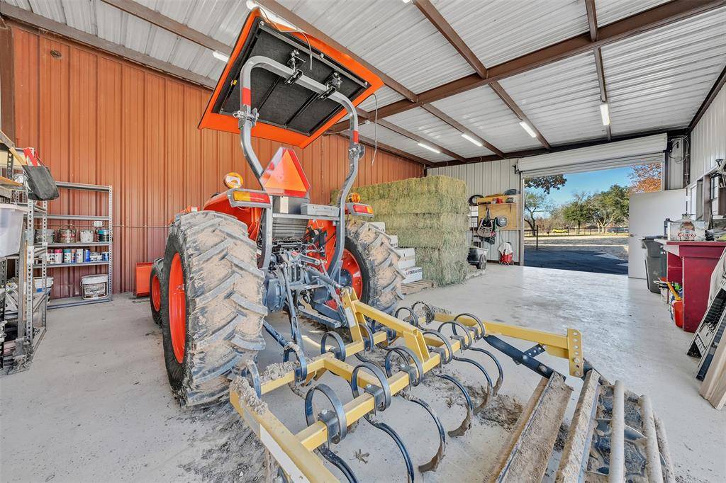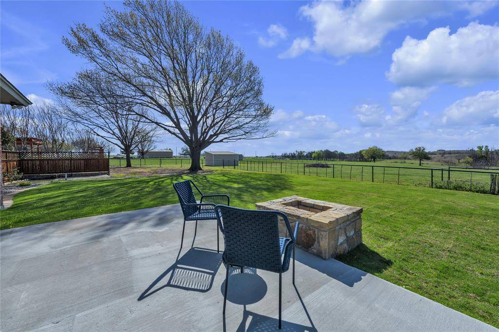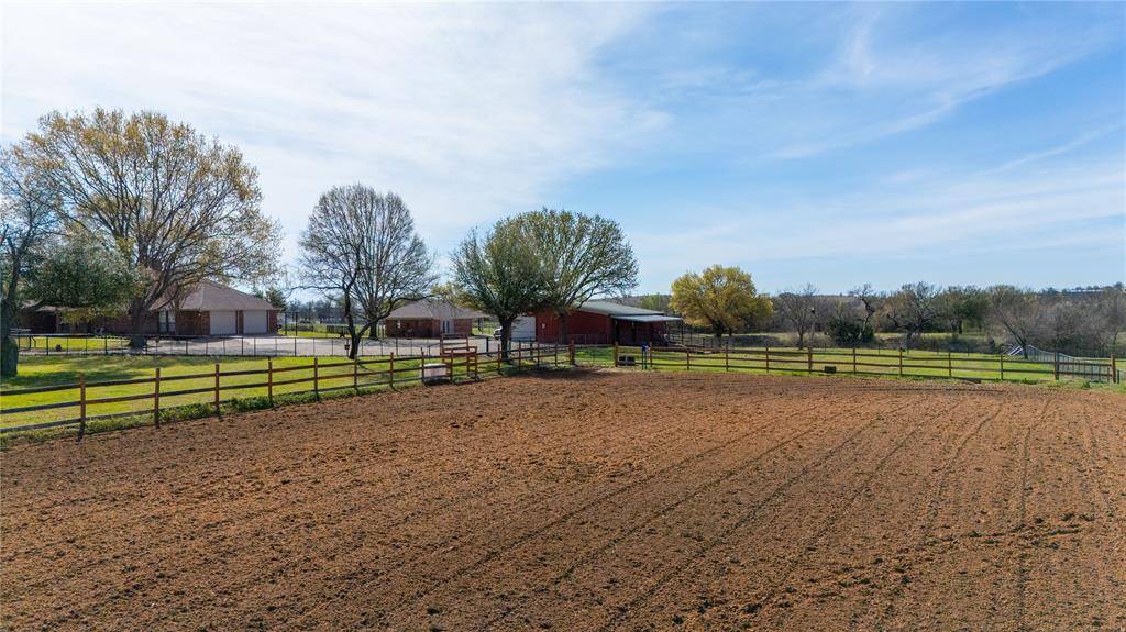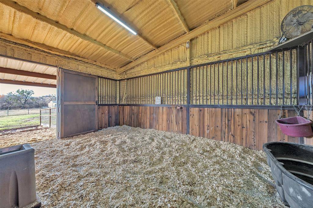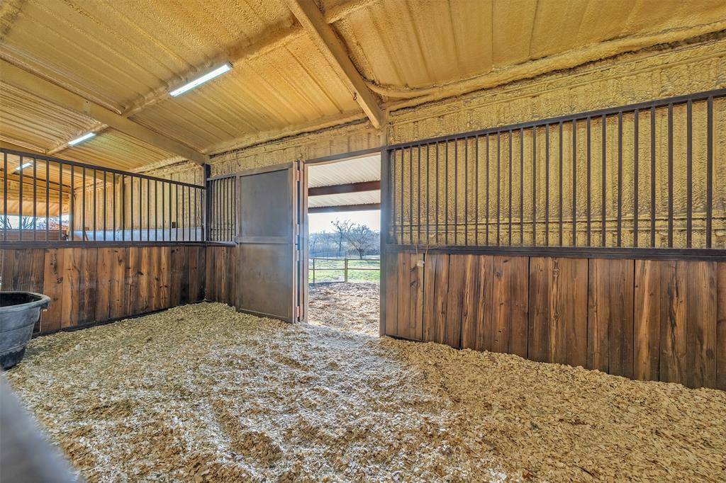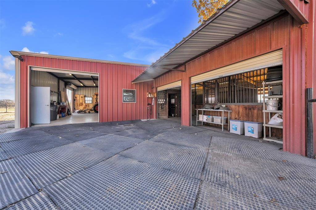 Outdoor living is exceptional, featuring a spacious concrete patio and artisanal outdoor fire pit, ideal for hosting summer gatherings. This space is further enhanced by a concrete pad already wired for a hot tub, offering the perfect spot to unwind and enjoy expansive Texas views. Designed with the serious horse owner in mind, the property is fully fenced and cross-fenced, with premium equestrian facilities that are second to none. The horse barn includes a dedicated tack room and four extra-large stalls: two featuring one inch premium mats and two with three quarter inch mats. All stalls include covered runs with automatic heated waterers for year-round comfort, plus hot water plumbed to the barn for professional bathing and grooming. The property is engineered with water plumbed to all three pastures and the lighted riding arena, which also features a dedicated sprinkler system for dust control. An additional loafing shed provides extra shelter, while the newly rewired shop offers ample room for equipment. This is a rare opportunity to own a property that seamlessly blends luxury living, elite equestrian amenities, and the tranquil beauty of Texas ranch life, all just minutes from DFW airport & Ft Worth, Tx