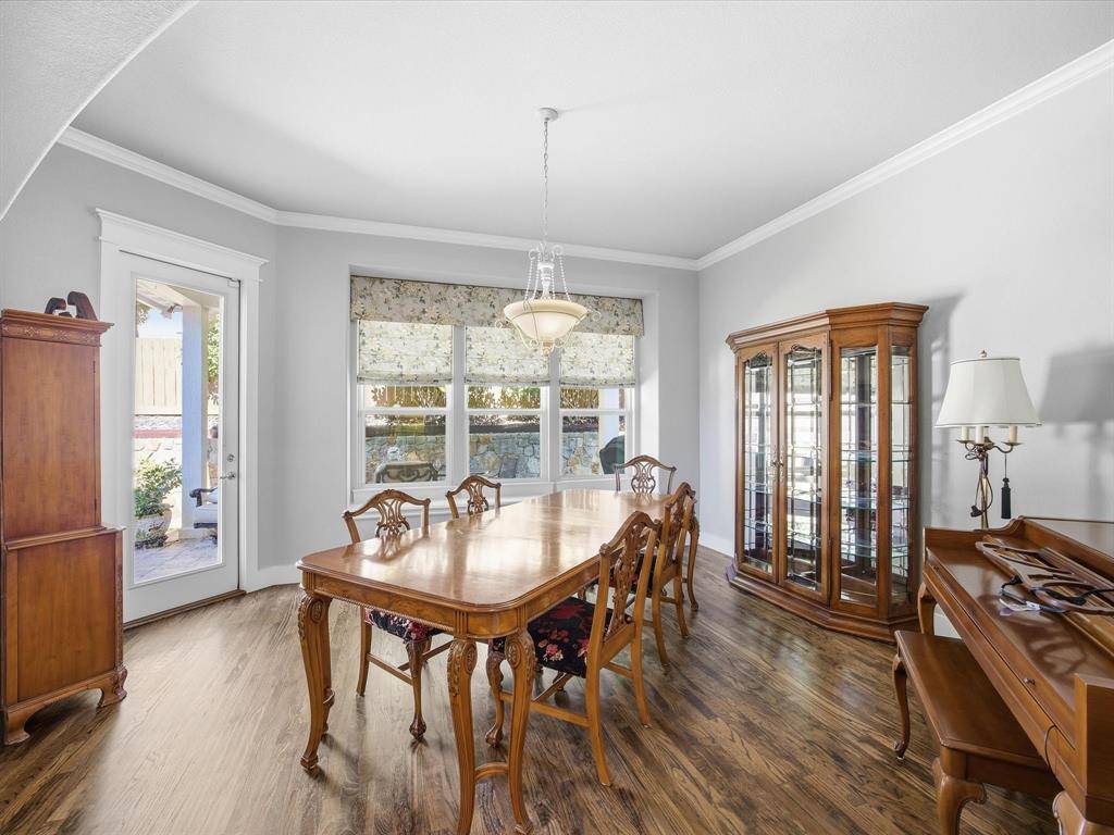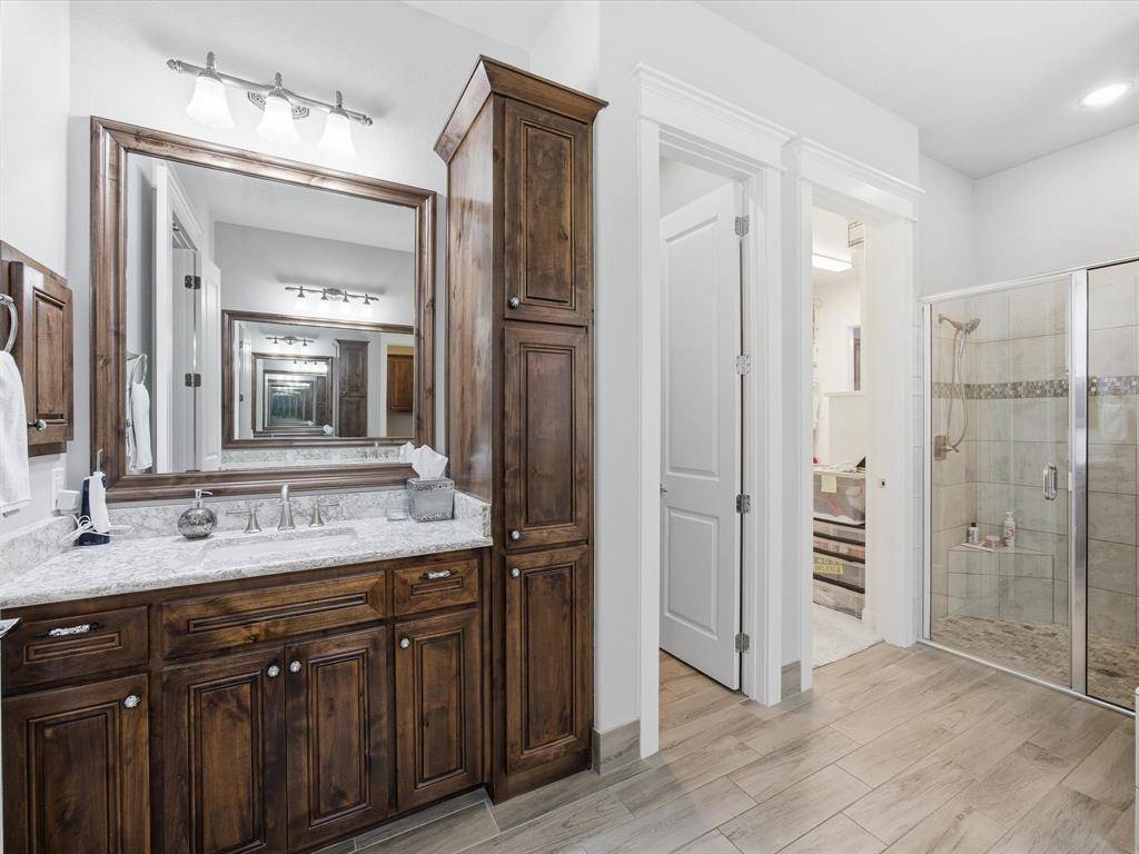 This stunning residence exudes timeless craftsmanship and thoughtful design. Constructed in 2016 by Noble Builders, this one-owner home was custom designed with premium upgrades & attention to detail throughout. From the elegant millwork and wide baseboards to the pediments accenting 8-foot doors, every finish reflects quality construction. Inside, real hardwood flooring flows through most of the home. The chef-inspired kitchen is equipped with a Kenmore Elite induction range & convection oven & additional features include custom 42-inch cabinetry with an antique glaze finish, quartz countertops, a center island with breakfast bar & stainless steel appliances. The spacious dining area opens seamlessly to the living room, where a stone fireplace with gas starter, auto ignition & direct vent serves as a stunning focal point. Expansive windows offer tranquil views of the private backyard from the living room, dining area, and primary suite. The primary retreat features hardwood flooring, a tray ceiling & cozy sitting area. Double doors lead to the spa-like ensuite bathroom, which includes dual under-mount sinks, quartz countertops, tower cabinetry, an oval soaking tub, & a separate walk-in shower. The custom closet offers built-in drawers, cubbies, and dual seasonal hanging areas, with direct access to the utility room, which features a granite-topped folding counter, built-in sink, & hanging space. The home's layout includes a powder bath off the main living area and split secondary bedrooms, both featuring walk-in closets & bathroom to accommodate guests. A mudroom with built-in bench seating sits conveniently by the two-car garage, which includes a single front-entry door, automatic opener, elevator lift, attic access, & keyless entry. Plantation shutters and window treatments throughout. Outside, the home is beautifully landscaped with full irrigation & a custom extended patio, perfect for outdoor gatherings or morning coffee.