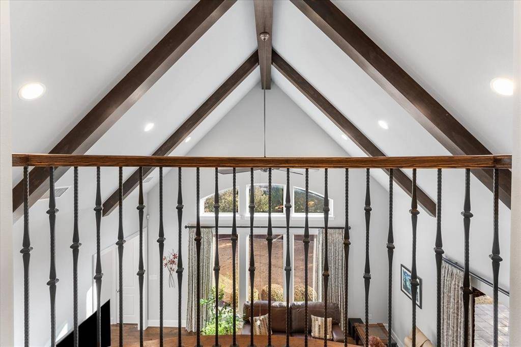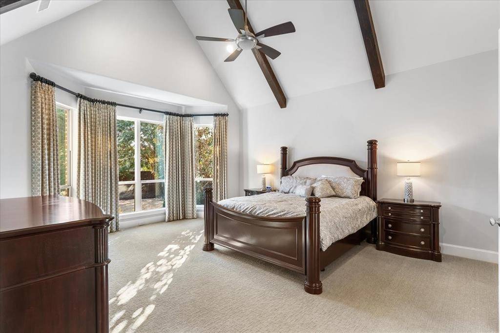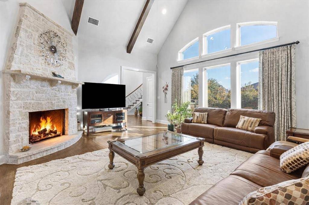 Architectural details such as wood paneling in the private study, ceiling beams, custom drapery, gas log fireplace with remote, and thoughtfully designed living spaces reflect a home that was curated, not rushed. A rare three-car garage with dual entrances adds everyday convenience and privacy to a floorplan that balances elegance with livability.