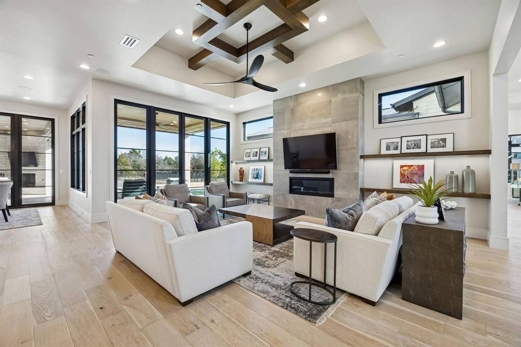 A rare opportunity in gated Saddleback Estates, this Atwood Custom Homes residence sits on a sprawling one-acre lot with a private pond and a striking modern aesthetic. From the moment you arrive, a dramatic glass-door entry and a wall of windows frame views of a custom water feature, setting the tone for the exceptional design found throughout. The home offers 4 bedrooms, 4.1 baths, and a 4-car garage, with predominantly downstairs living designed for both comfort and elevated entertaining. The open-concept living room, kitchen, and breakfast area create a seamless central gathering space, while a secondary catering kitchen tucked behind the main kitchen allows for high-level entertaining with ease. A private office with a sleek glass wall delivers a modern, inspiring workspace. The game room is a destination of its own, featuring a wet bar with wine fridge and direct access to the patio, perfect for hosting and indoor-outdoor living. Step outside to a true resort-style retreat: a covered patio with built-in grill and fireplace overlooks a custom Claffey pool and spa complete with multiple water features, offering year-round enjoyment and unforgettable views. The private primary suite is a serene escape overlooking the backyard, paired with a luxurious spa-inspired bath featuring an oversized walk-in shower, soaking tub, dual vanities, and separate walk-in closets. Thoughtfully designed, impeccably built, and effortlessly stylish, this home blends modern luxury with everyday livability in one of the area's most exclusive gated communities.