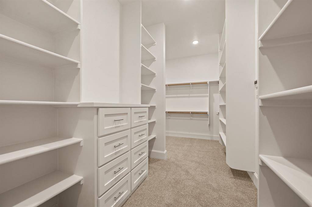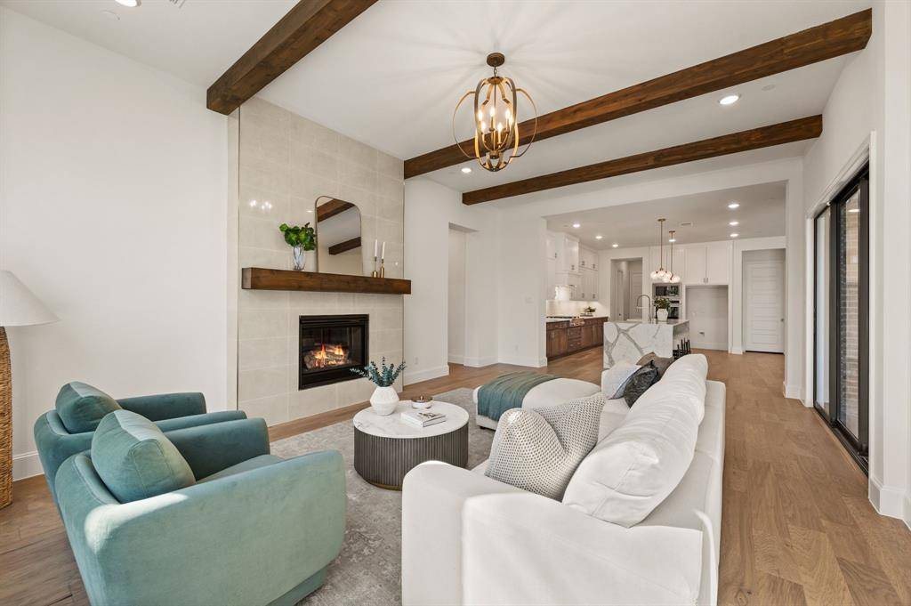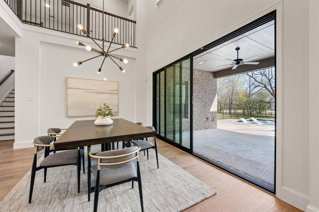 Welcome to this stunning 2025-built Drees Custom Home, perfectly situated on a spacious .812-acre corner lot in the established Ravenwood Addition. Offering 4 bedrooms, 5 bathrooms, and a 3-car garage with a desirable 2+1 configuration, this home blends modern luxury with thoughtful design. Step inside to soaring ceilings, abundant natural light, and beautiful hardwood floors that guide you through a private front office and into the expansive open-concept living, dining, and kitchen areas. Designed for both everyday living and entertaining, the chef's kitchen features a striking waterfall island with Calacatta quartz countertops, soft-close cabinetry, a 6-burner commercial-grade gas cooktop, dual convection ovens, and a fully equipped prep kitchen with its own electric cooktop, sink, and extensive pantry shelving. The primary suite is conveniently located on the first floor and serves as a true retreat, complete with an oversized walk-in closet and a spa-inspired bathroom featuring a Hollywood soaking tub, dual vanities, and a spacious walk-in shower with multiple shower heads. The elegant utility room connects directly to the primary suite and includes a large sink and front yard views. A secondary bedroom with a full bath downstairs provides ideal accommodations for guests or multigenerational living. Upstairs, you'll find a spacious game room, dedicated media room, and a versatile flex space perfect for a fifth bedroom, hobby room, or additional storage. Seamlessly blending indoor and outdoor living, large sliding glass doors open to your private backyard oasis. Enjoy a heated Claffey pool and spa with tanning ledge and LED lighting, a pool bath with exterior access, additional patio space ready for an outdoor kitchen, and a Hunter Hydrawise smart sprinkler system. This exceptional home offers luxury, functionality, and resort-style living all in one, an opportunity you won't want to miss.