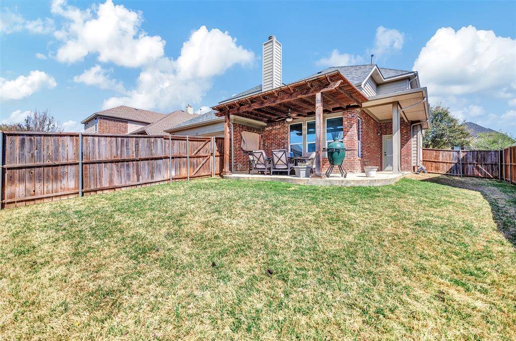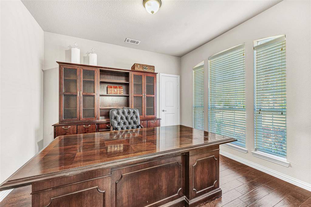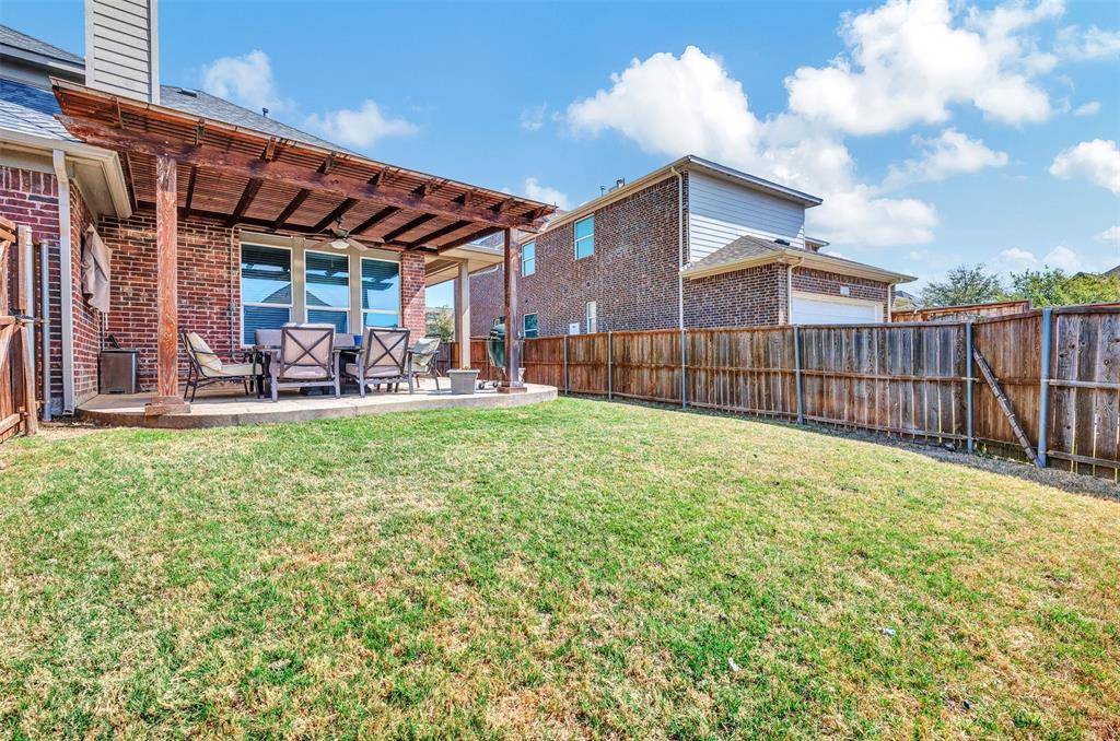 Welcome to this beautifully designed Frisco home where comfort meets luxury. Rich wood floors and soaring ceilings create a warm, open feel in the spacious family room—perfect for both everyday living and entertaining. The chef's kitchen features stainless steel appliances, knotty alder cabinetry, and a walk-in pantry, flowing seamlessly into the main living areas. A formal dining room and private office with closet add flexibility for work, gatherings, or guests. The primary suite offers a relaxing retreat with two large closets, a garden tub with TV, and generous storage. Upstairs you'll find three additional bedrooms, two full baths including a Jack-and-Jill layout, a game room, and a media room with built-in speakers—ideal for movie nights and family fun. Step outside to a large stamped concrete patio with a built-in TV, creating the perfect outdoor entertaining space. Additional highlights include a tankless water heater, 2023 roof, spacious laundry room with room for extra appliances, built-ins in two bathrooms, and convenient under-stair storage. A thoughtfully designed home offering style, comfort, and exceptional living in one of Frisco's most desirable communities.