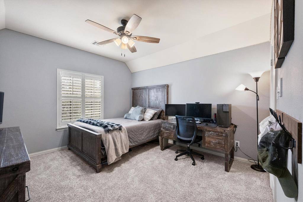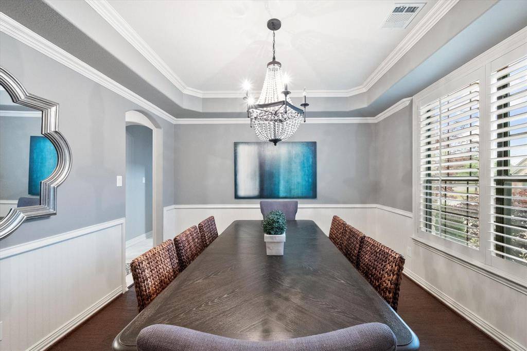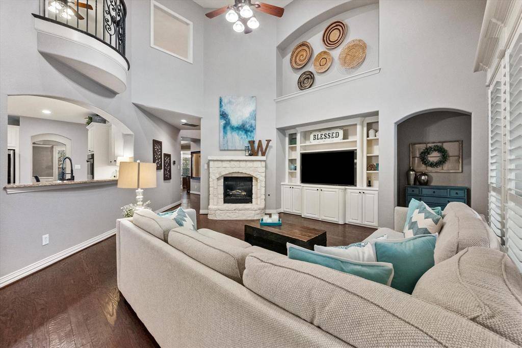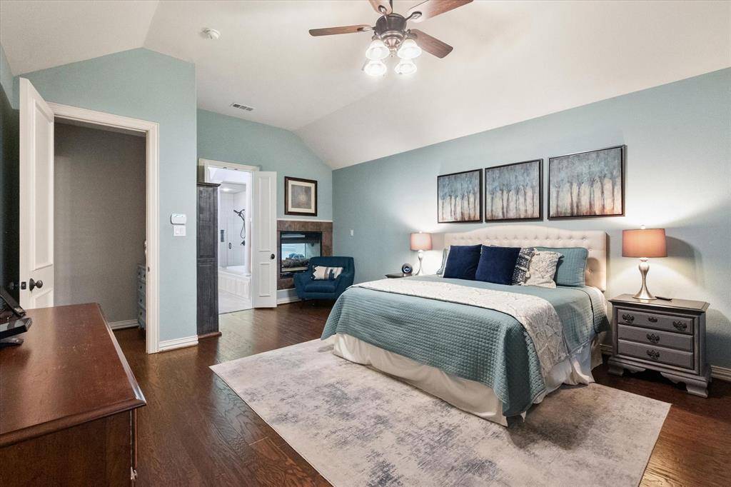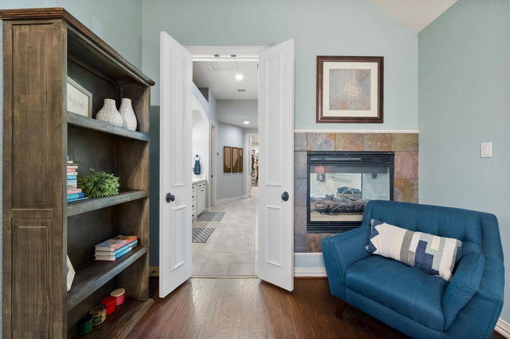 Welcome to this beautifully appointed 4-bedroom home in the highly sought-after Lakes of Creekwood, where thoughtful upgrades and a true backyard oasis come together. Rich wood flooring and plantation shutters add warmth and elegance, while the flexible floor plan offers a private office, oversized media room, and spacious game room. The updated kitchen features fresh paint and new flooring and opens seamlessly to the main living areas, making it ideal for both everyday living and entertaining. The primary suite is a true retreat with a fully remodeled, spa-inspired bath and a stunning double-sided fireplace shared between the bedroom and bath. Step outside to your private backyard oasis with a sparkling pool and spa, perfect for relaxing or hosting. A porte-cochère driveway and 3-car garage provides added functionality and ample parking. This one truly offers the perfect blend of comfort, style, and luxury living in one of the most desired communities in Mansfield, TX.
