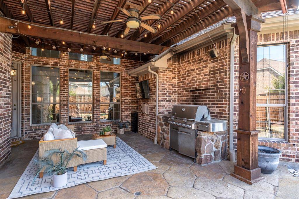 Set on one of the larger lots in Estates on Legacy Drive, this beautifully updated corner-lot home offers a backyard setting that is rarely found in the neighborhood. Designed for both everyday living and entertaining, the resort-style outdoor space features a sparkling pool and spa, an outdoor kitchen, fire pit, and a spacious wraparound lawn - creating the perfect balance of relaxation and play. Inside, a sunlit two-story foyer welcomes you into a thoughtfully designed home that balances style and functionality. At the heart of the home, the open-concept living room flows seamlessly into the kitchen and dining spaces, highlighted by a stunning floor to ceiling fireplace, custom shelving, and expansive views of the backyard retreat. The kitchen blends function and design with a built-in wet bar or coffee nook, walk-in pantry, stainless steel appliances, gas cooktop, and double ovens. The primary suite offers updated flooring, a redesigned fireplace, and a cozy sitting nook, complemented by a spacious bath with dual vanities and a generous walk-in closet. Upstairs, you'll find three well appointed bedrooms, a large recreation room, a dedicated movie room, and a versatile bonus space with two built-in workstations - perfect for work, study, or play.