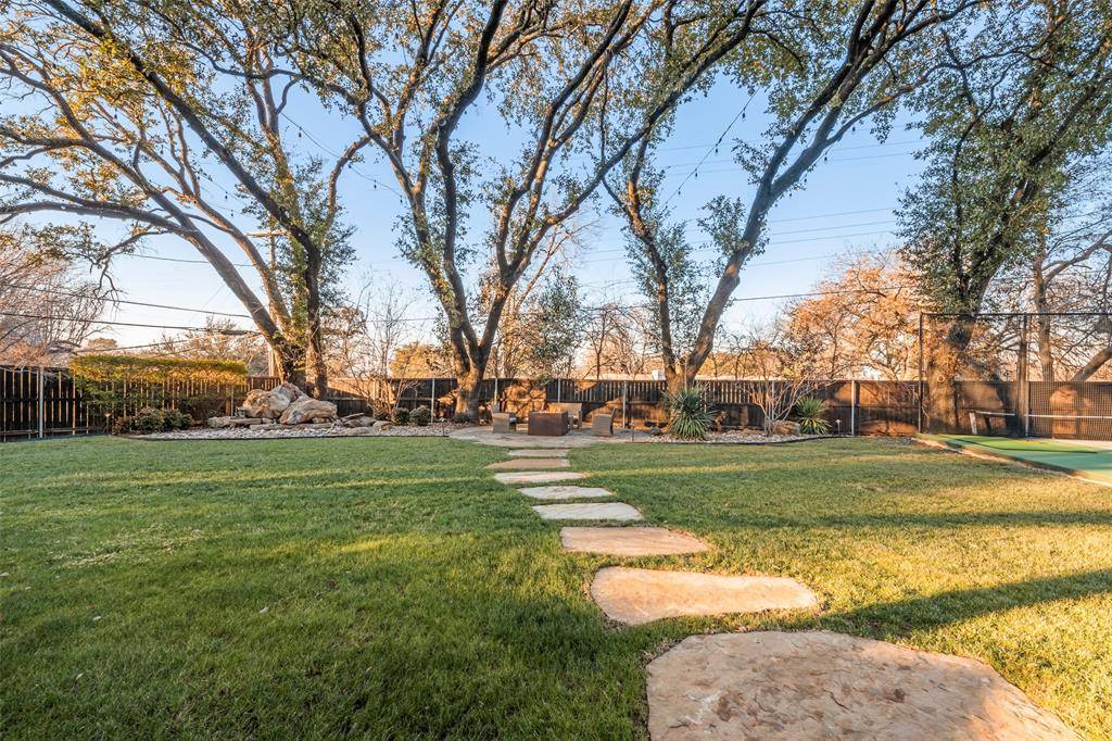 Outdoor living is a true highlight. The backyard is designed for both relaxation and recreation, featuring a large covered patio, a separate outdoor sitting area, and a rock waterfall feature that creates a peaceful setting beneath the canopy of mature trees. A dedicated sports court adds another layer of versatility for play and entertainment.