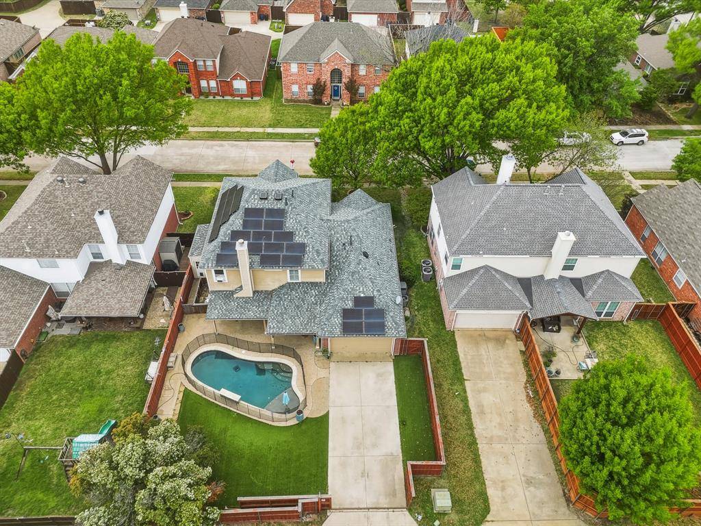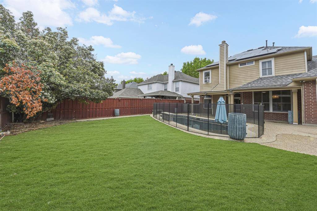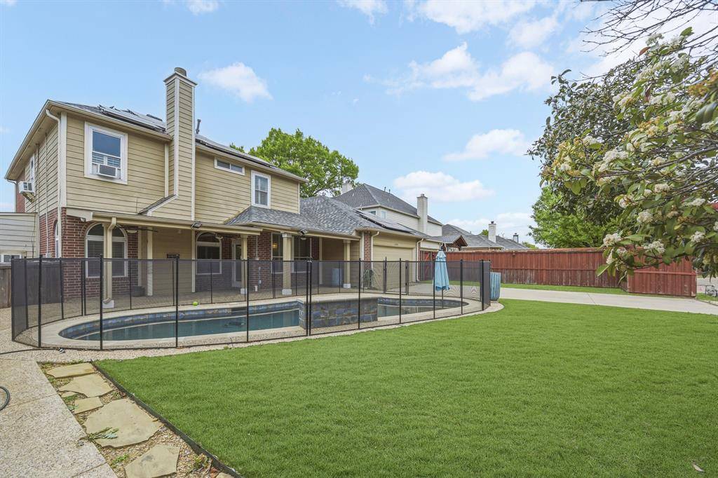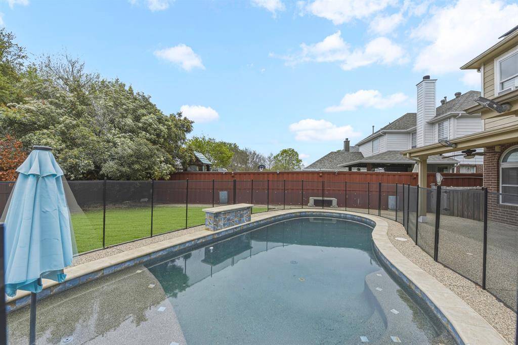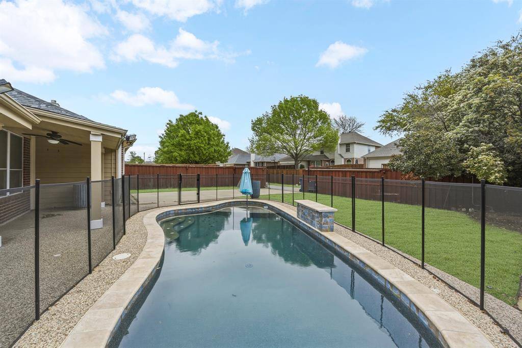 This beautiful Frisco home features a spacious turfed backyard, a large patio, and a stunning pool that has been recently upgraded with a new pump, retiling, PebbleTec finish, an eye-catching water feature and pool lights. The backyard and garage area also include an electric fence for added convenience and security. Located in a community with no HOA, the home is enhanced with Trimlight exterior lighting, creating a warm and elegant glow at night.