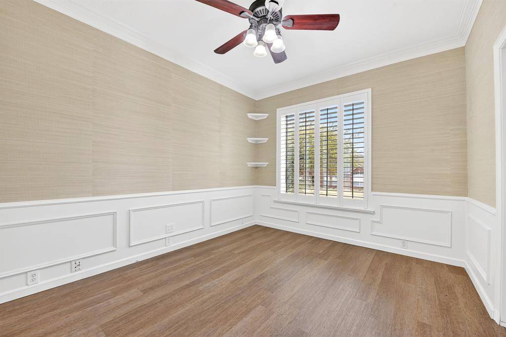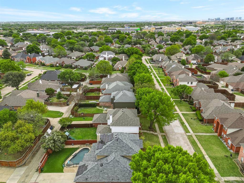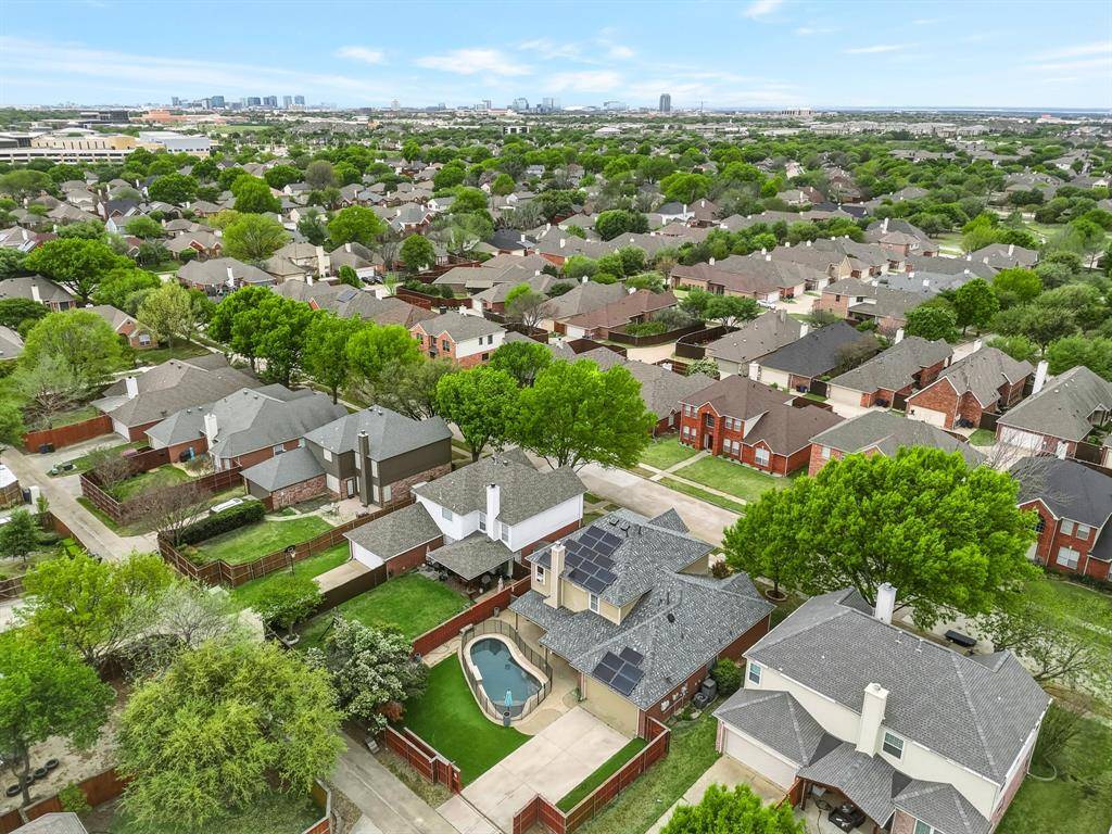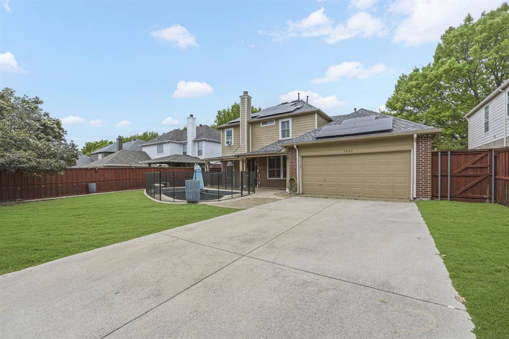 This beautiful Frisco home features a spacious turfed backyard, a large patio, and a stunning pool that has been recently upgraded with a new pump, retiling, PebbleTec finish, an eye-catching water feature and pool lights. The backyard and garage area also include an electric fence for added convenience and security. Located in a community with no HOA, the home is enhanced with Trimlight exterior lighting, creating a warm and elegant glow at night.