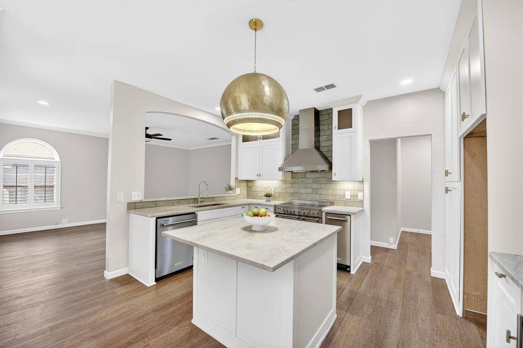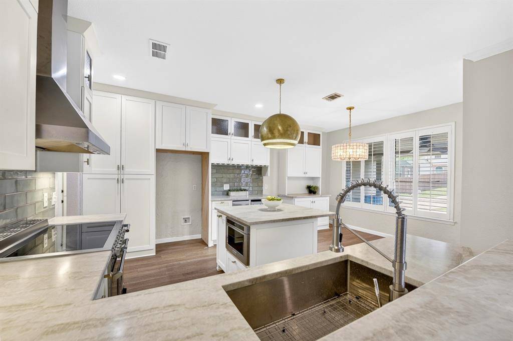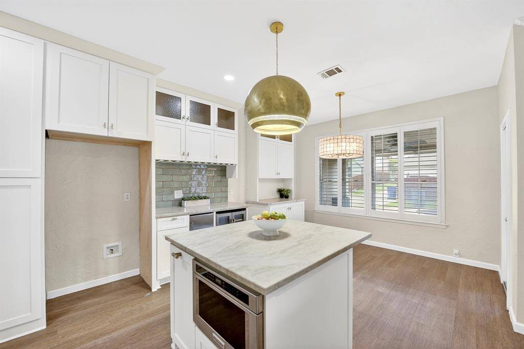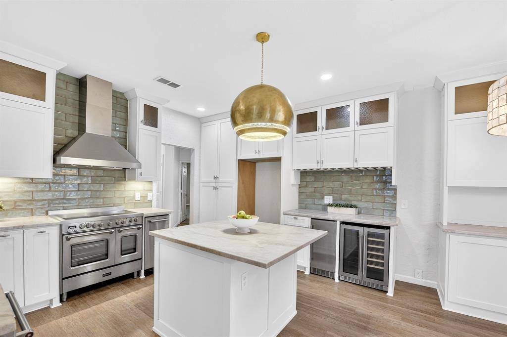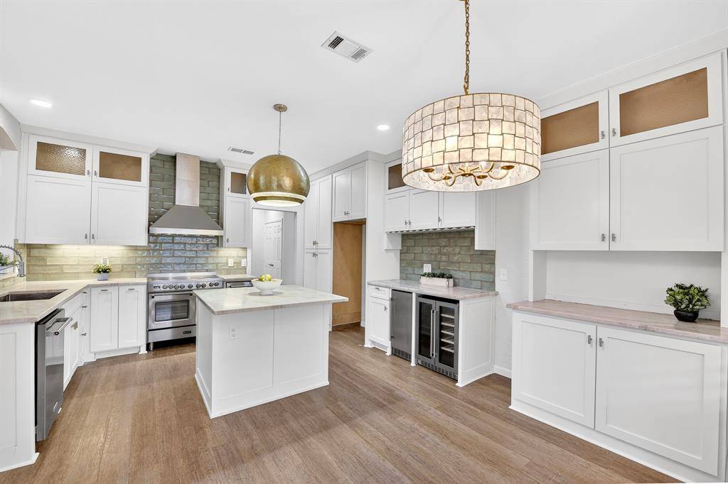 Step inside to find gorgeous luxury vinyl and hardwood flooring throughout, complemented by tall ceilings that create a grand and inviting entrance. The kitchen has been recently upgraded with KitchenAid appliances, including a double oven and wine fridge, along with beautiful countertops, a stylish backsplash, a large island with ample prep space, and a trash compactor.
