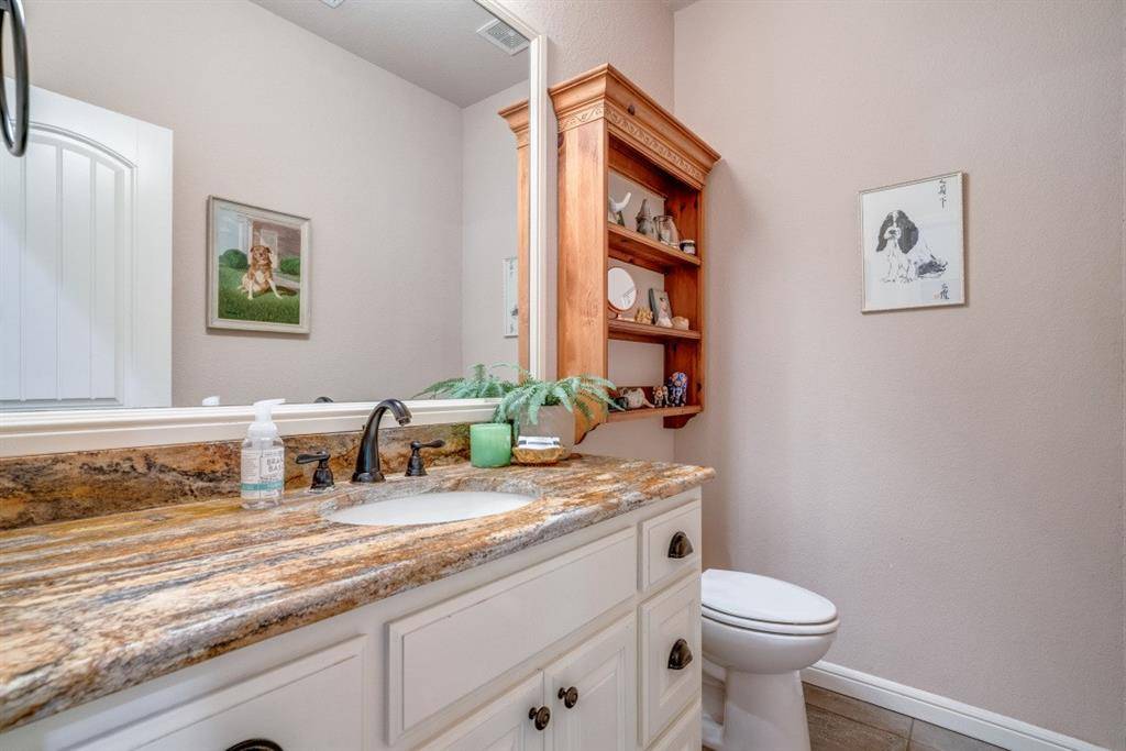Kitchen includes stainless GE appliances, granite countertops, and custom glass-front cabinetry. Split-bedroom design with spacious primary suite featuring dual vanities, walk-in closets, tiled shower, and garden tub. Two secondary bedrooms plus a flexible office or playroom. Oversized laundry room with granite folding counter and ample storage.
